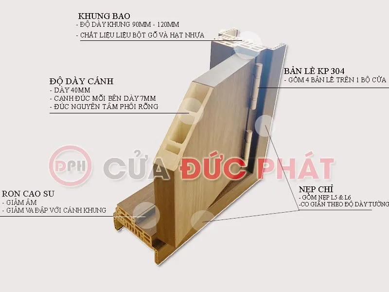 – Khung bao được làm từ vật liệu nhựa gỗ, bề mặt phủ phim PVC đồng bộ, kết hợp gioăng cao su giảm chấn.