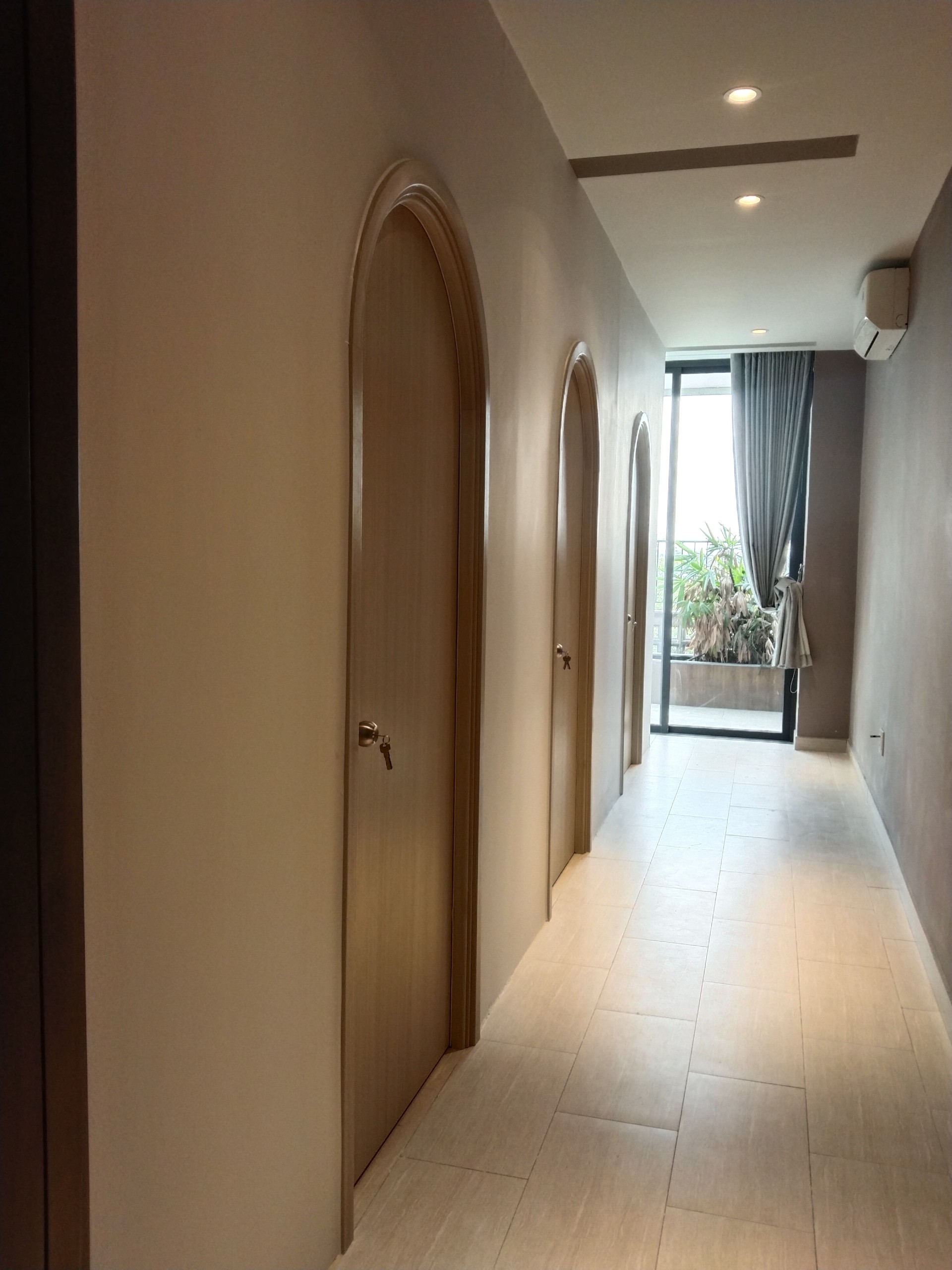 - Cửa vòm gỗ công nghiệp có thiết kế với 2 phần: bên dưới là 2 góc vuông và phần trên có cấu trúc hình vòng cung mểm mại.